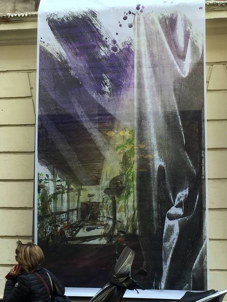 Su richiesta di Claire Fatosme e Christian Lefevre, fondatori e architetti dell'hotel C2, che le hanno dato carta bianca, è stata lei a sospendere la lounge nel cielo, realizzando i sei pannelli decorativi, perfettamente abbinati al soffitto originale restaurato.