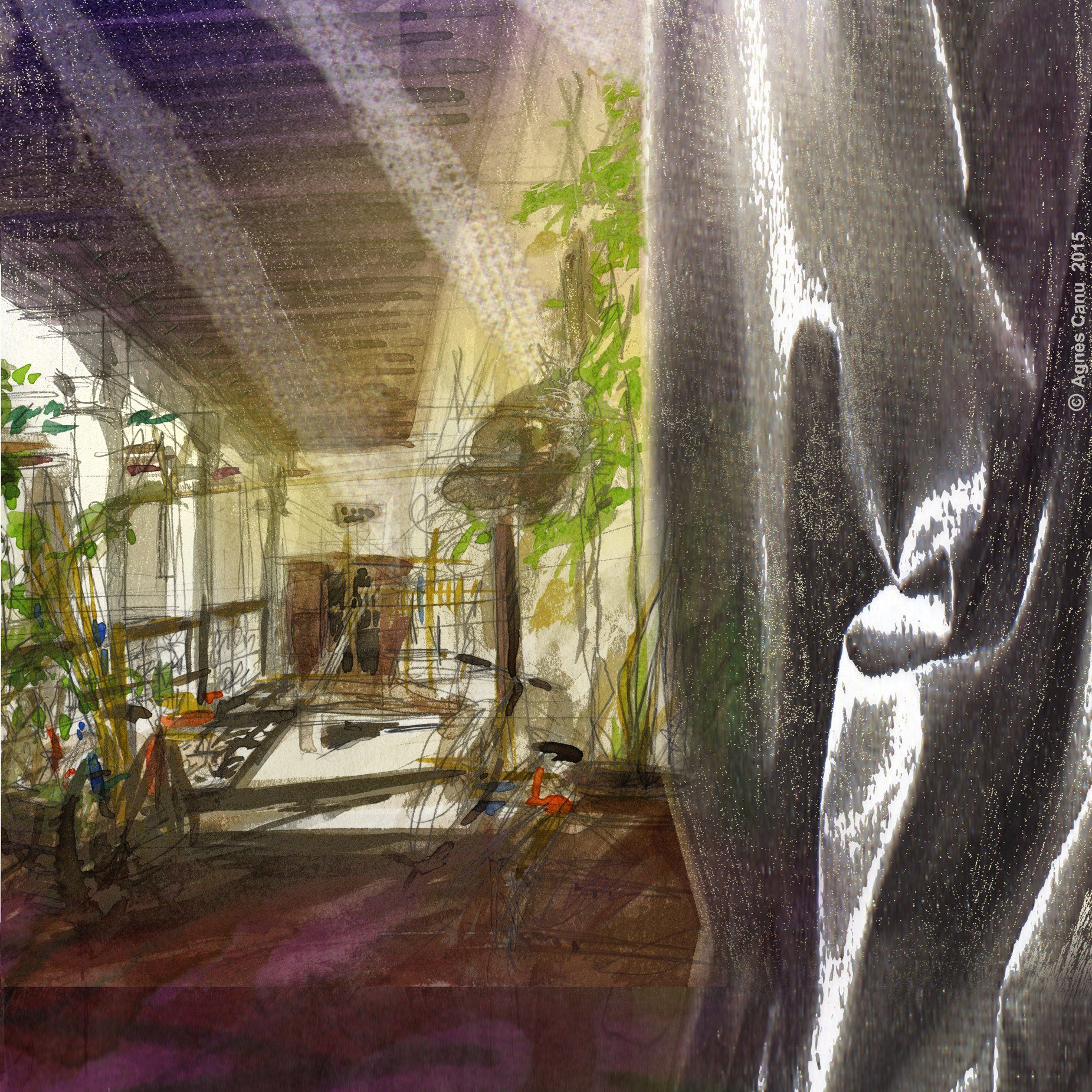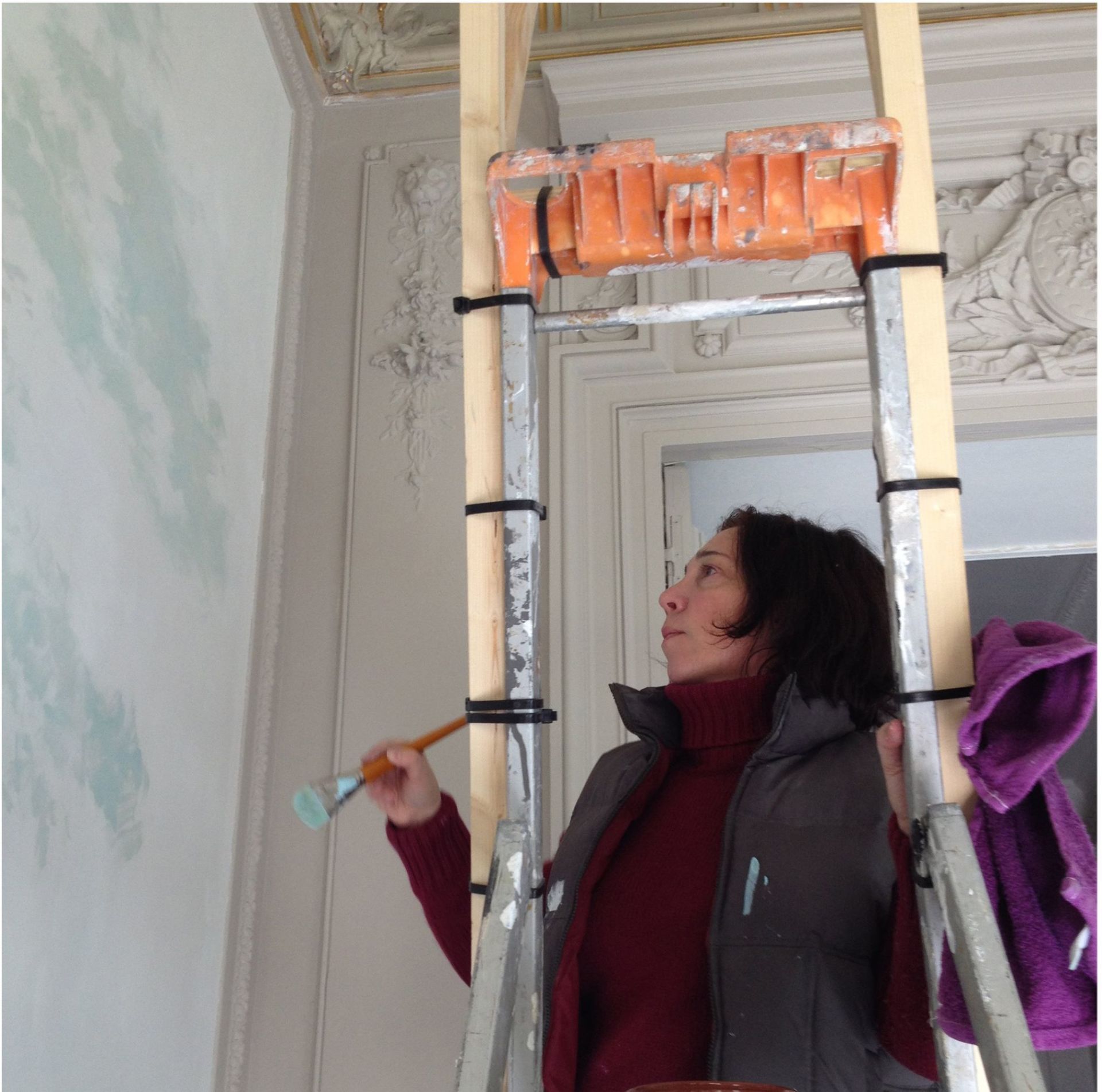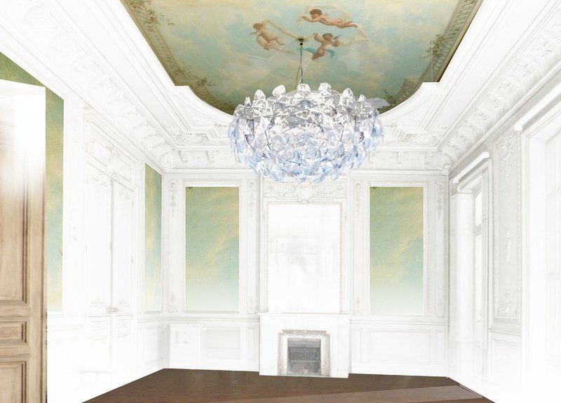 A la demande de Claire Fatosme et Christian Lefevre , fondateurs et architectes de l’hotel C2, qui lui ont donné carte blanche, c’est elle qui a suspendu le lounge dans le ciel, en créant les six panneaux décoratifs, parfaitement assortis au plafond d’origine restauré.